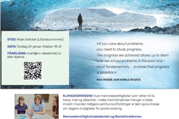 Torsdag 29. januar kl 1800-2100 i Litteraturrommet. Påmelding KLIMAENDRINGENE truer menneskerettigheter som retten til liv, helse, mat og sikkerhet. I møte med klimakrisen trenger vi både innsikt i hvordan tidligere samfunnsutfordringer er løst og kunnskap om dagens muligheter for positiv endring. Menneskerettighetsakademiet, Besteforeldrenes Klimaaksjon i Agder og Risør bibliotek inviterer til en kveld med foredrag … HÅP OG HANDLING Seminar om klima, miljø og menneskerettigheter: